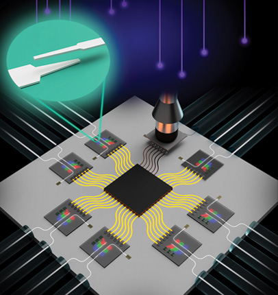 A co-packaged optics system with an electrical chip (black, center) surrounded by eight silicon photonic chips. Chips are bonded using an automated pick-and-place tool, shown placing the final chip into position. The automation is enabled by a novel optical chip-to-chip coupler (green callout). [D. Weninger et al. Adv. Eng. Mat. 27, 2402095 (2025)]