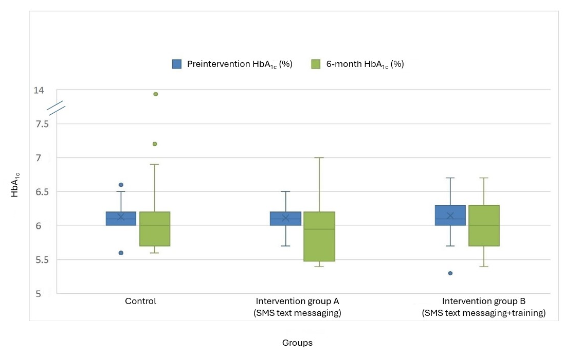 The primary outcome was HbA1c levels at the 6-month time point. HbA1c level was selected as the primary outcome because it is a well-established, objective biomarker that reflects long-term glycemic control and is widely used in diabetes research and clinical practice [,]. This choice aligns with the study’s research objective, which was to assess the effectiveness of the PREDIABETEXT digital intervention in preventing T2DM among individuals with prediabetes.