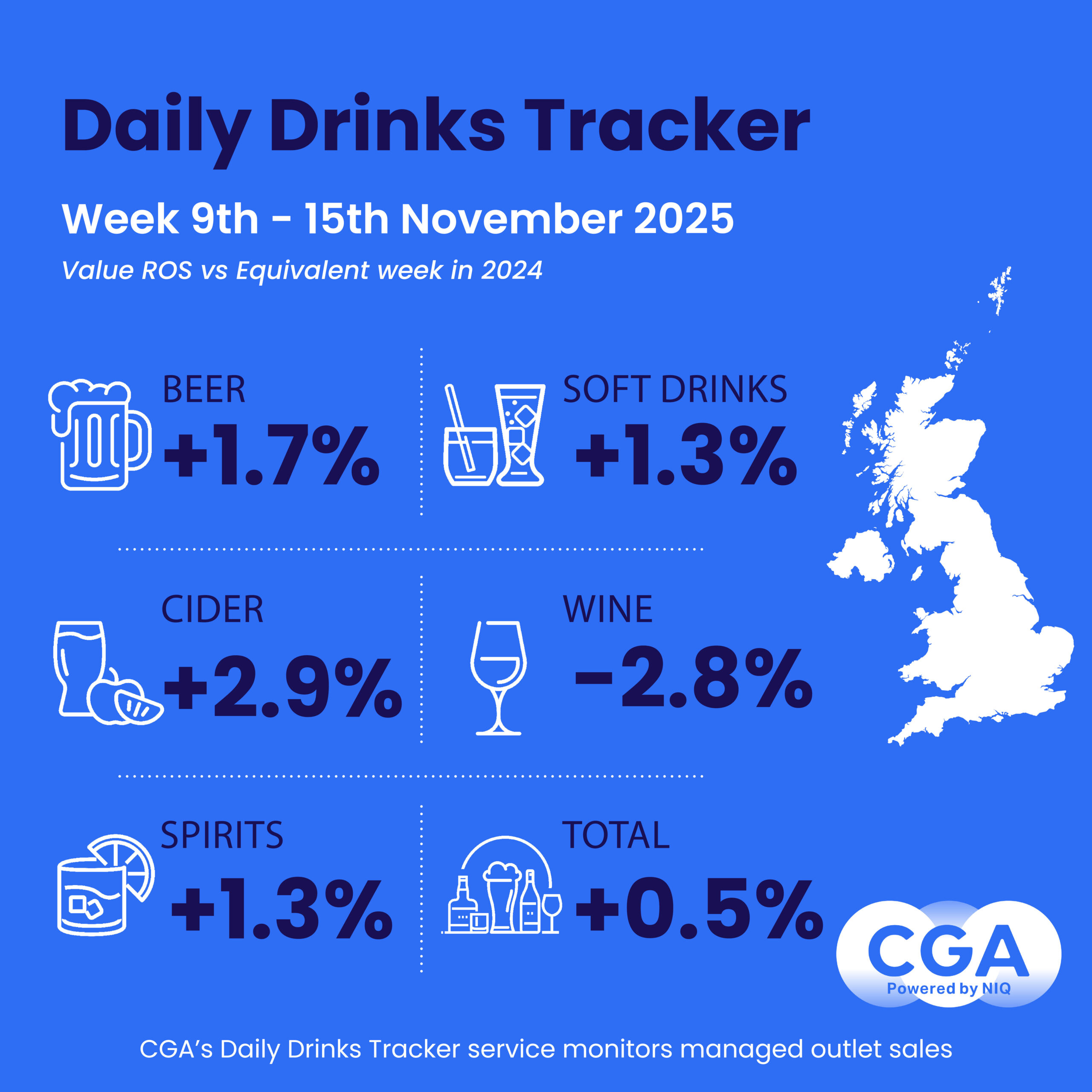 CGA by NIQ’s latest Daily Drinks Tracker shows average sales in managed venues in the week to 8 November were 2.3% ahead of the same period in 2024. This was followed by growth of 0.5% in the following seven days to 15 November.