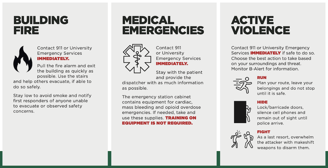 If you are experiencing an emergency, you can reach University emergency services by dialing (607) 777-2222 from any phone or dialing 911; pressing the emergency call button at any emergency station at blue light phone; or using the SAFEBING app and press “Call 911 Now!” or “Campus BlueLight.”
