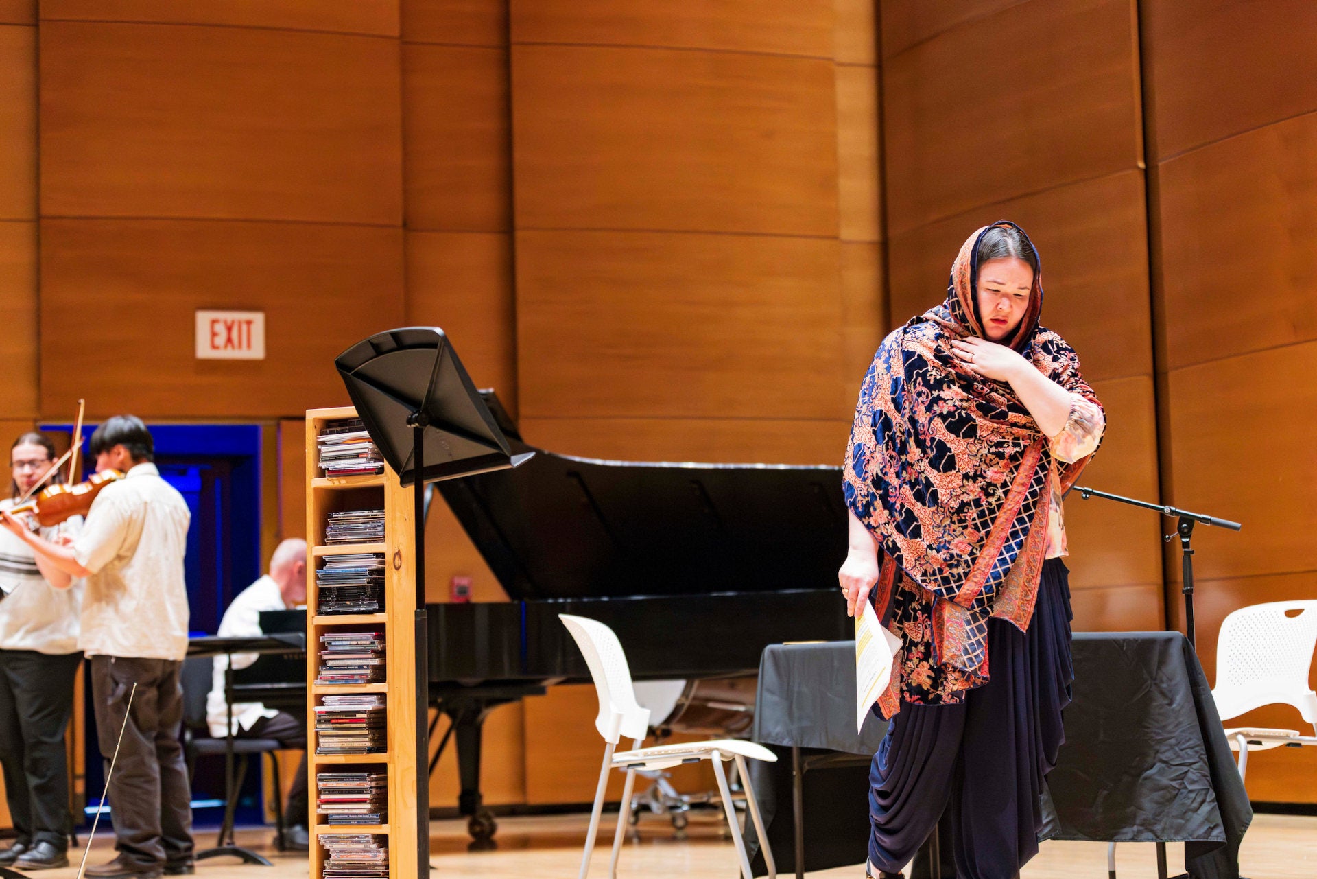 The setting telegraphed that this was not a standard concert. A grand piano and bass drum shared the Distler Auditorium stage with a podium and a simple table draped with a black cloth, a microphone in the middle.