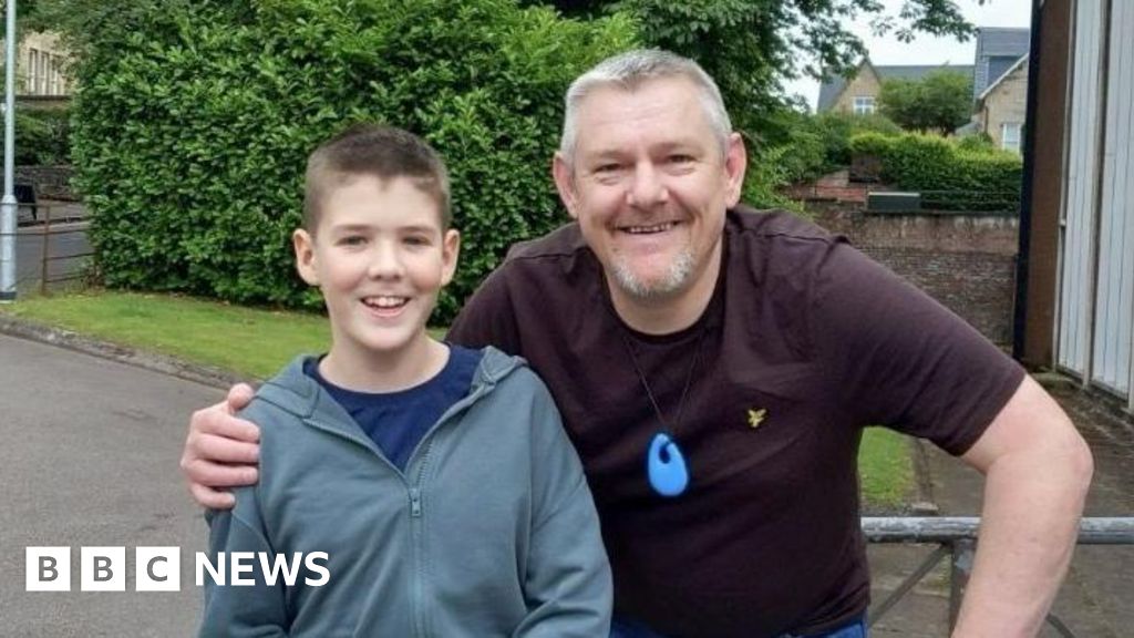 Sharon Knight There is a young boy wearing a grey coat and blue pants. He has brown hair. He is being hugged by an older man with grey hair. He is wearing a maroon t-shirt, around his neck is a blue silicone toy. They are stood in front of some trees. They are both smiling. Sharon Knight