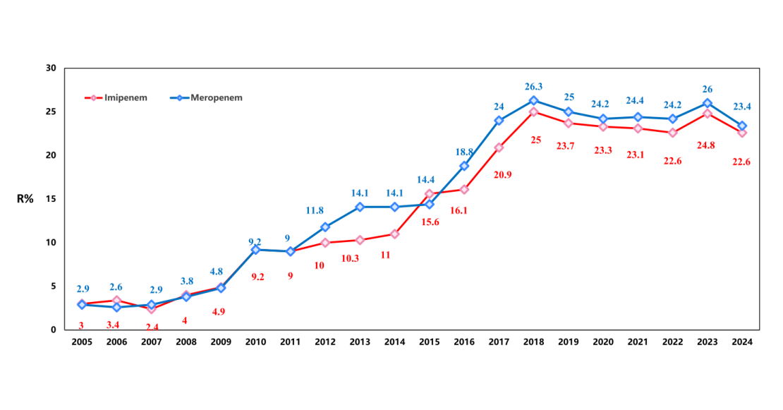 Changing resistance rates of K. pneumoniae strains to imipenem and meropenem in CHINET antimicrobial resistance surveillance program 2005–2024.