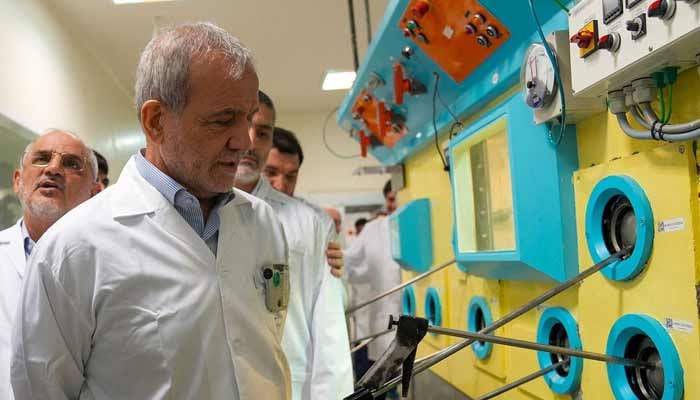 Iranian President Masoud Pezeshkian visits the Iranian Atomic Energy Organisation in…
