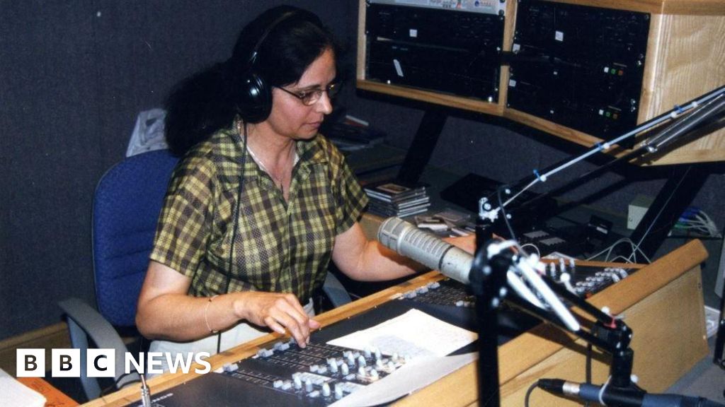 Stories That Made Us archive A woman wearing headphones sits in front of a microphone at a radio desk in the 1990s.Stories That Made Us archive