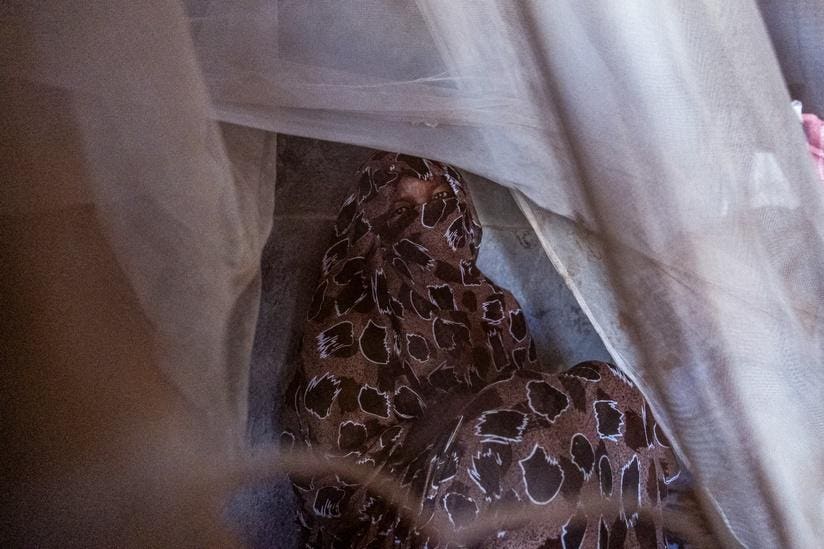 Sudanese refugee sits under a mosquito net inside her shelter at the Tine transit camp in Chad on November 8, 2025. With the last army stronghold in Sudan’s western Darfur region having fallen to paramilitary forces on October 26, the United…