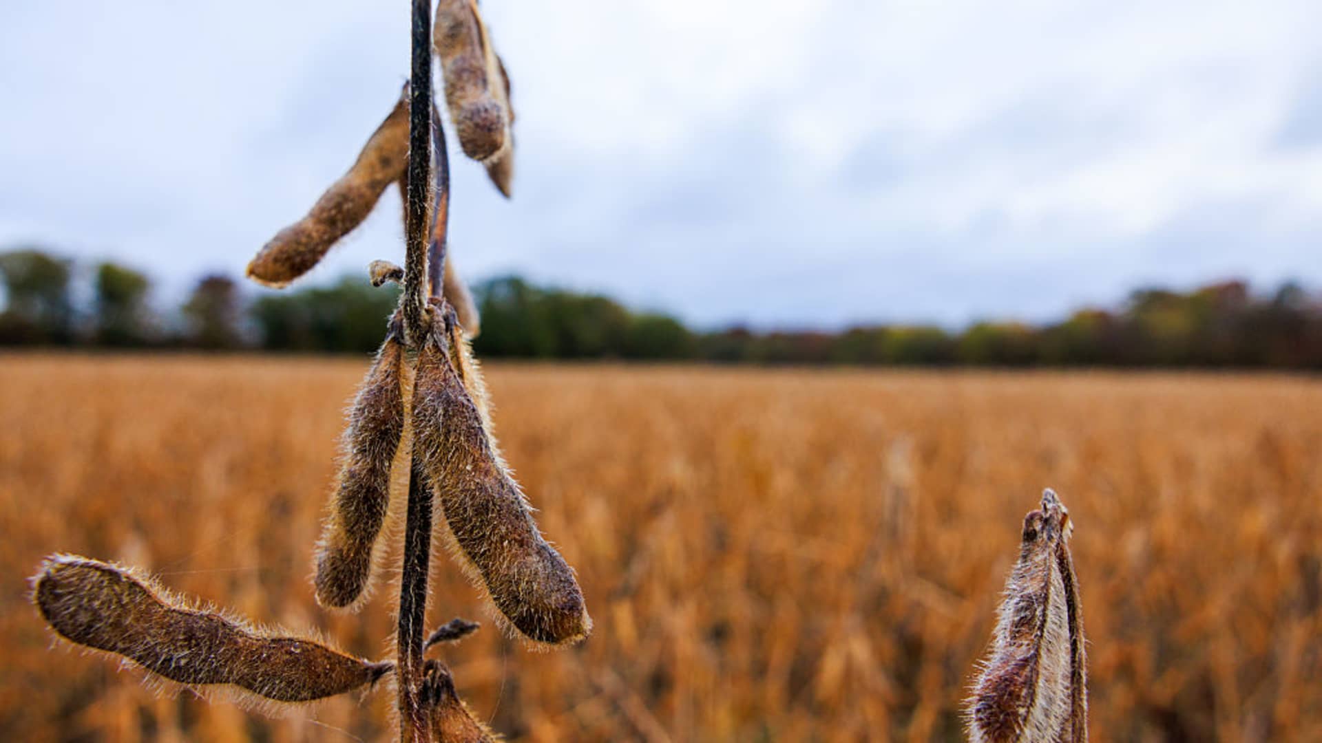 Mature soybeans remain unharvested near North Maple Grove Road after a rain shower on October 28, 2025, in Ellettsville, Indiana.