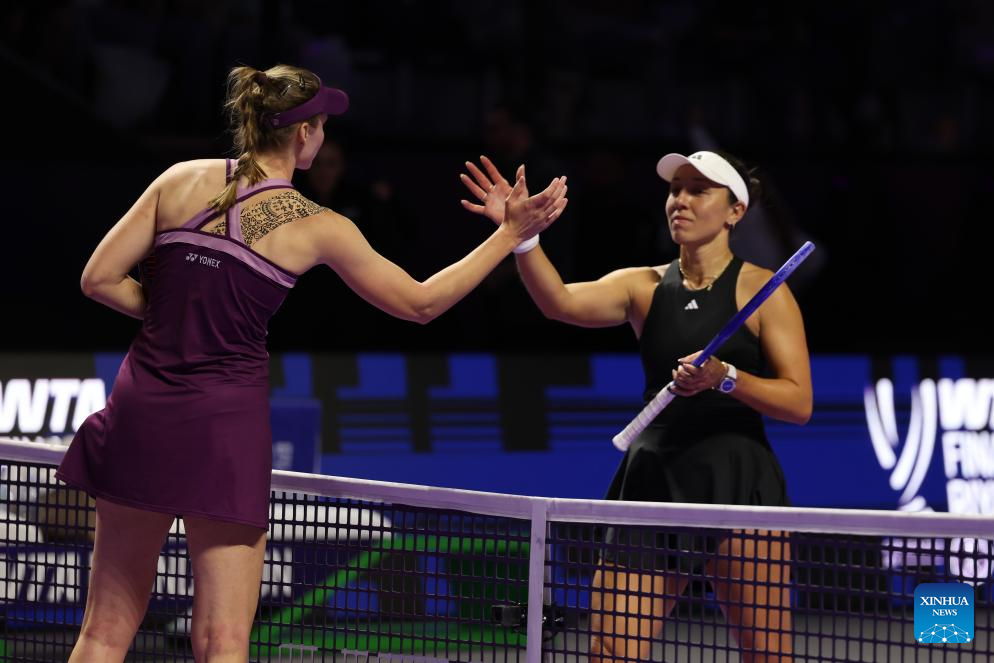 Elena Rybakina (L) and Jessica Pegula pose for photos before the semifinal between Elena Rybakina of Kazakhstan and Jessica Pegula of the United States at WTA Finals tennis tournament in Riyadh, Saudi Arabia, Nov. 7, 2025. (Xinhua/Wang Haizhou)